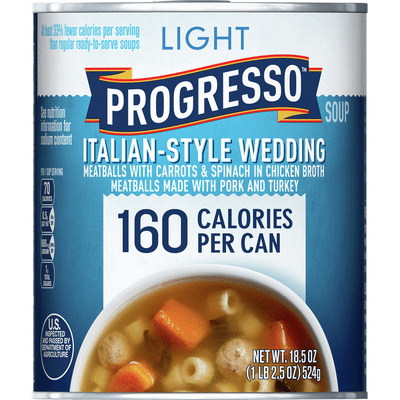 Progresso Traditional Soup Italian-Style Wedding. Calorie Goal 1880 cal. Look up serving sizes nutrition facts and how long it will take to burn off the calories.